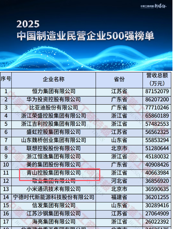 青山、振石、宏旺、甬金等上榜“2025中國(guó)民營(yíng)企業(yè)500強(qiáng)”